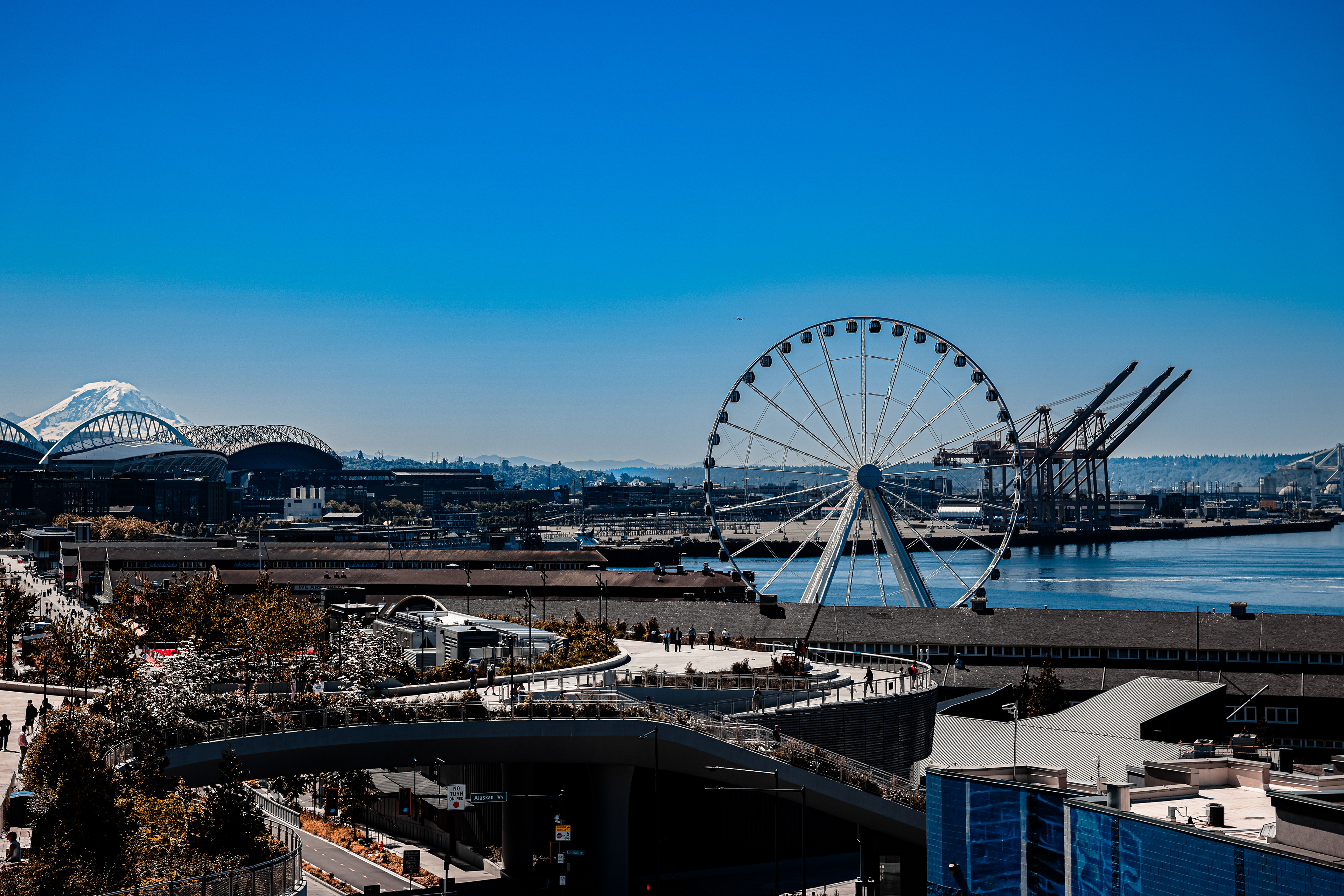 A clear day over Pier 56. The Great Wheel, the stadiums, and Mount Rainier all in one frame.