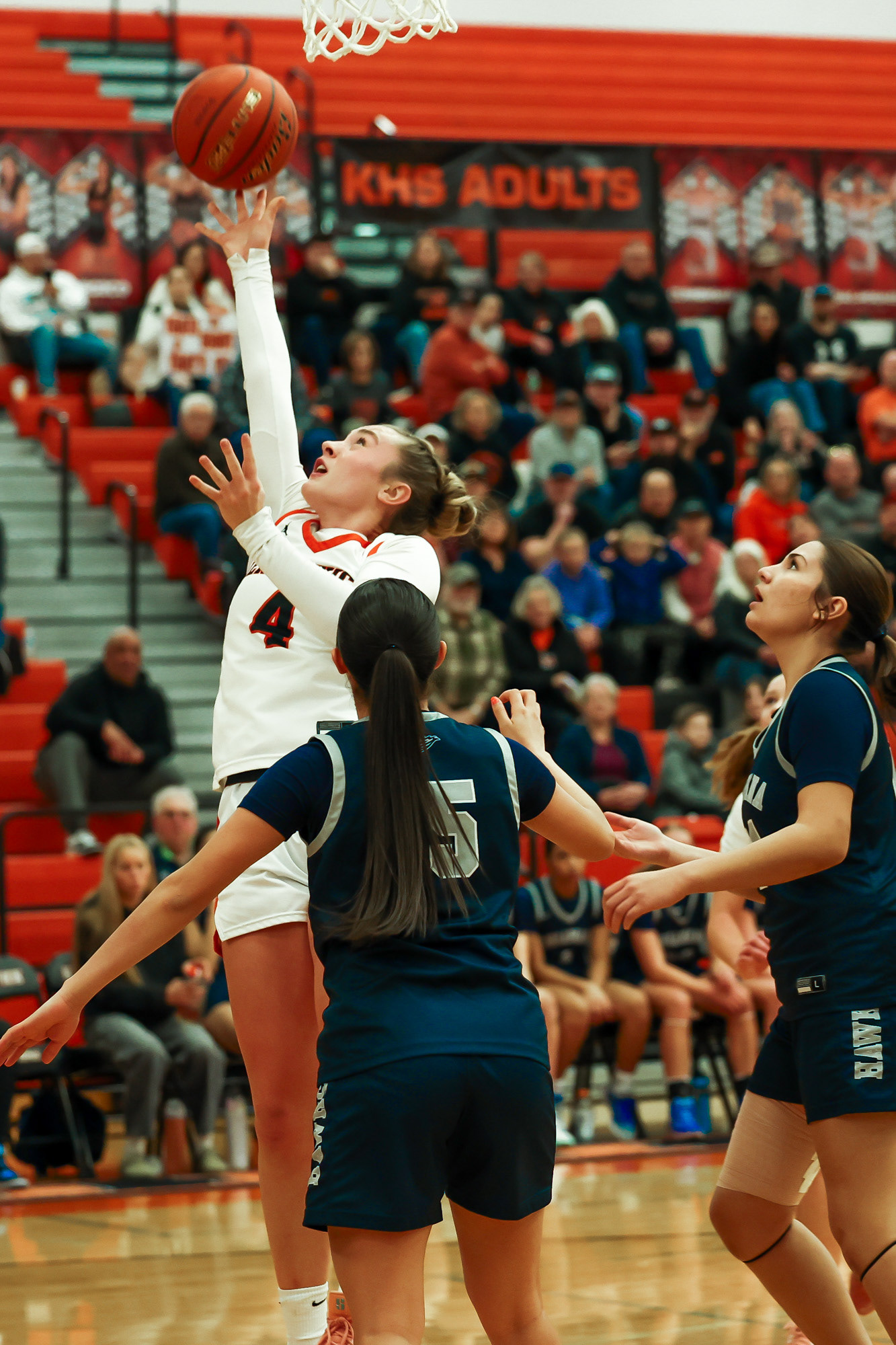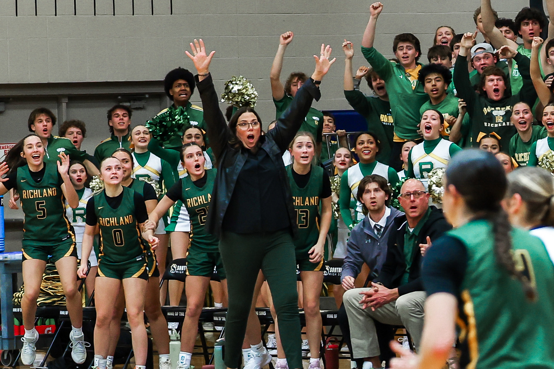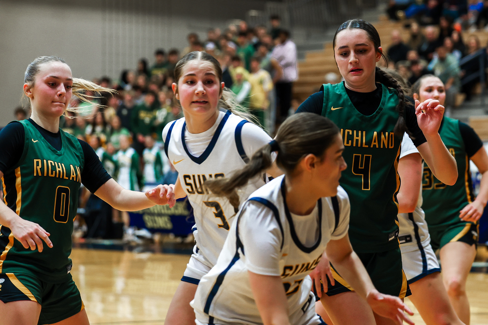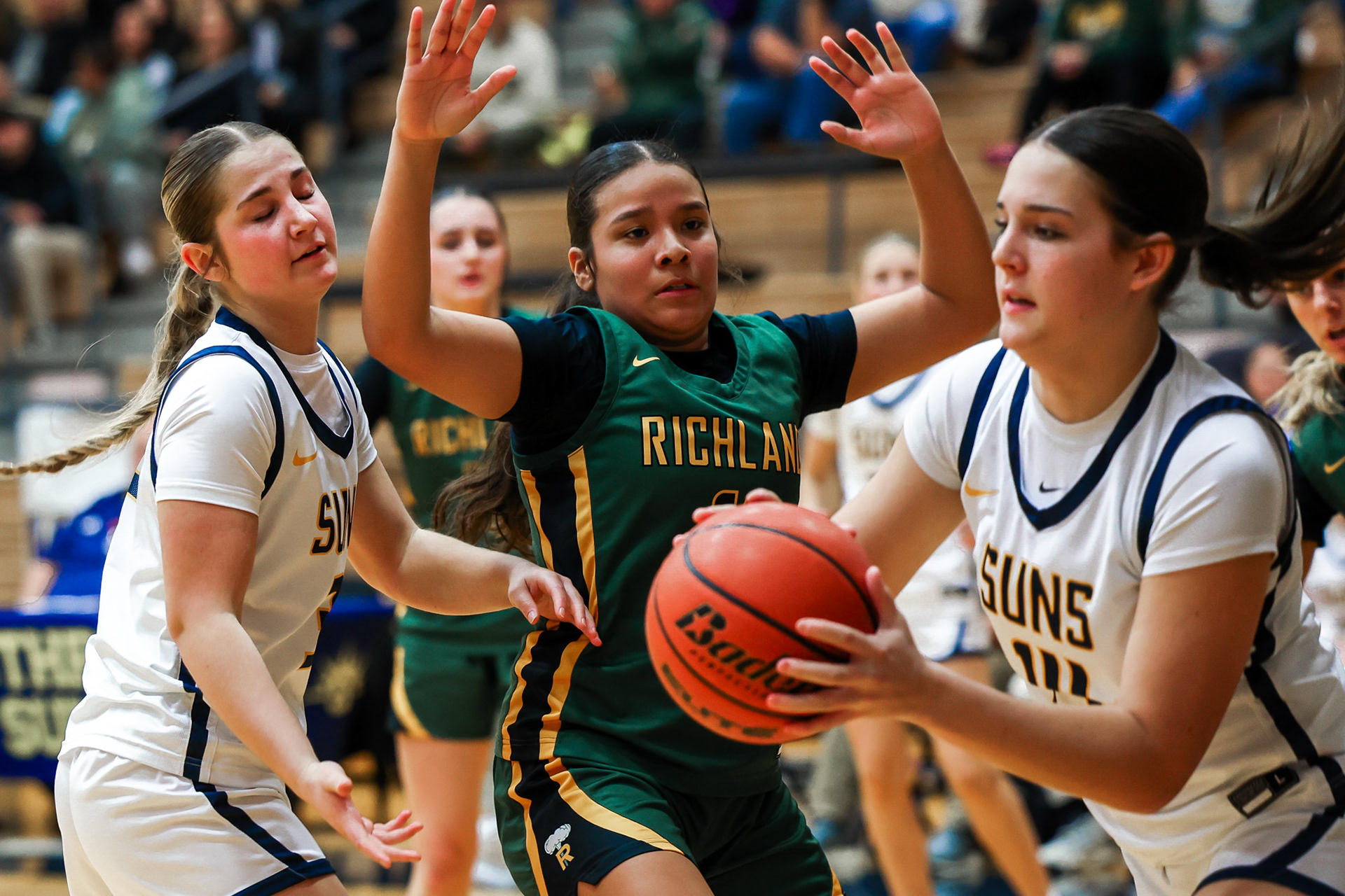 Richland High School Girls Volleyball players block a shot at the net during a home game against Walla Walla.