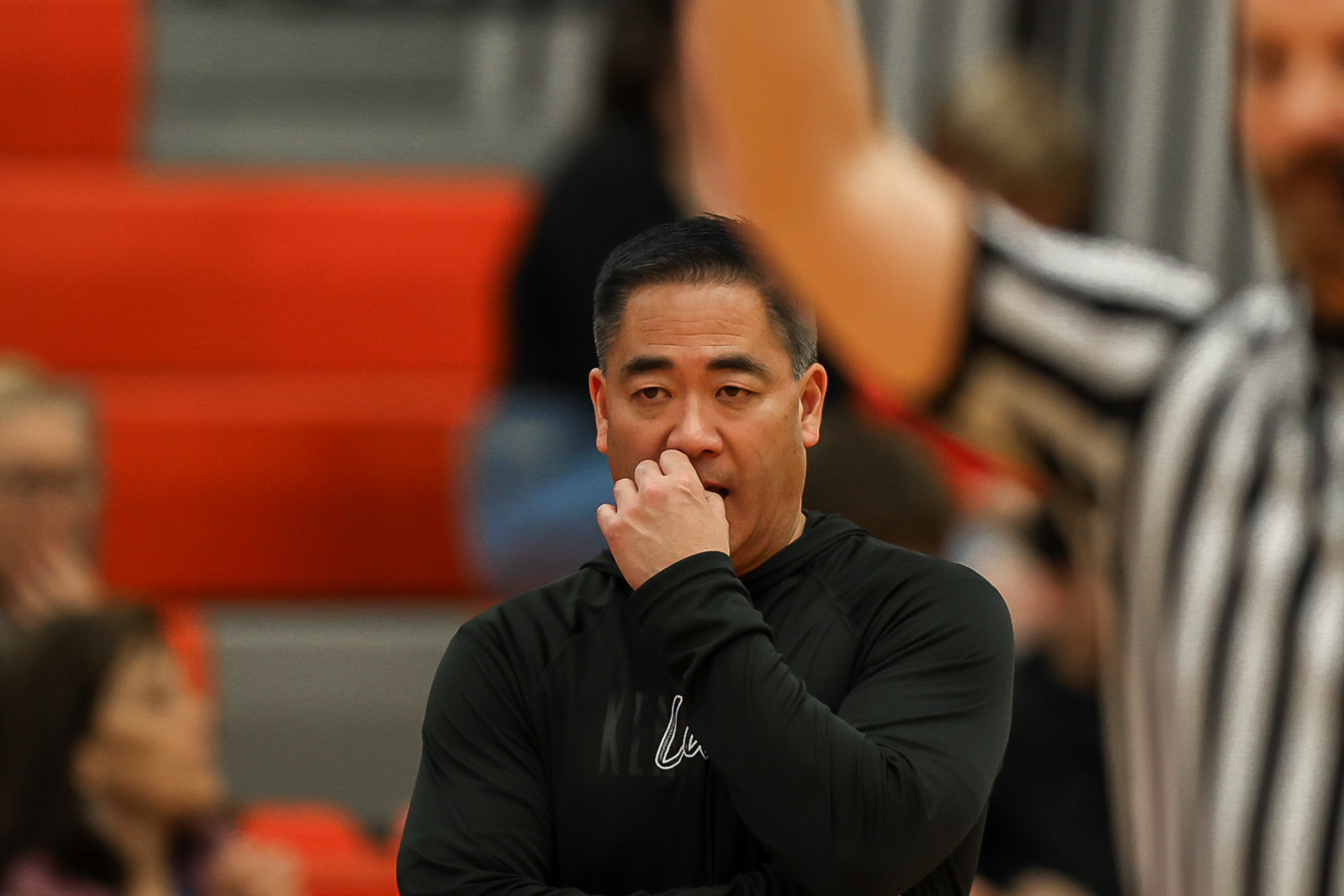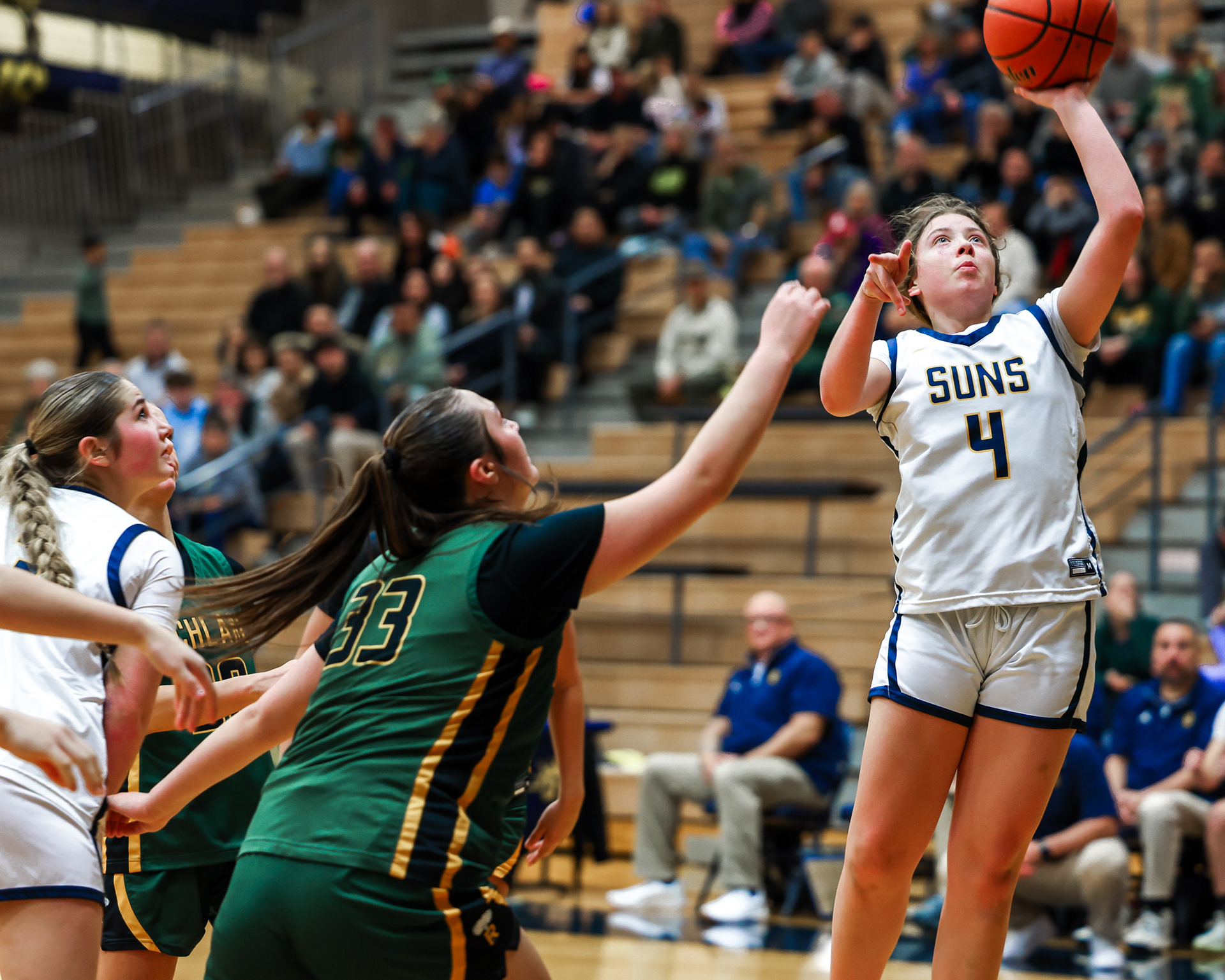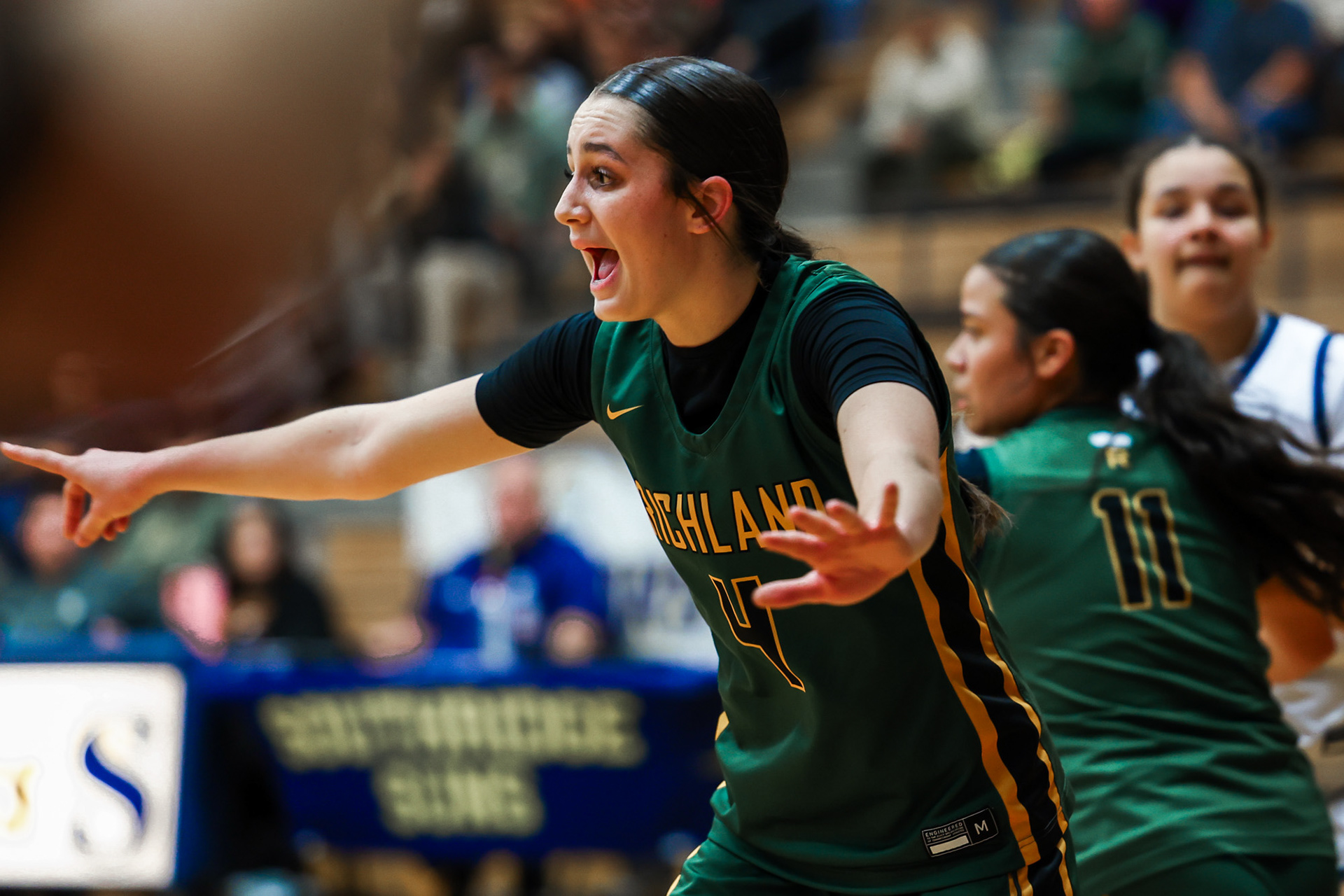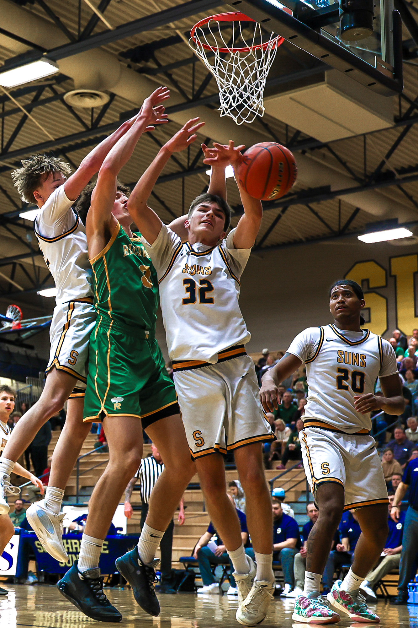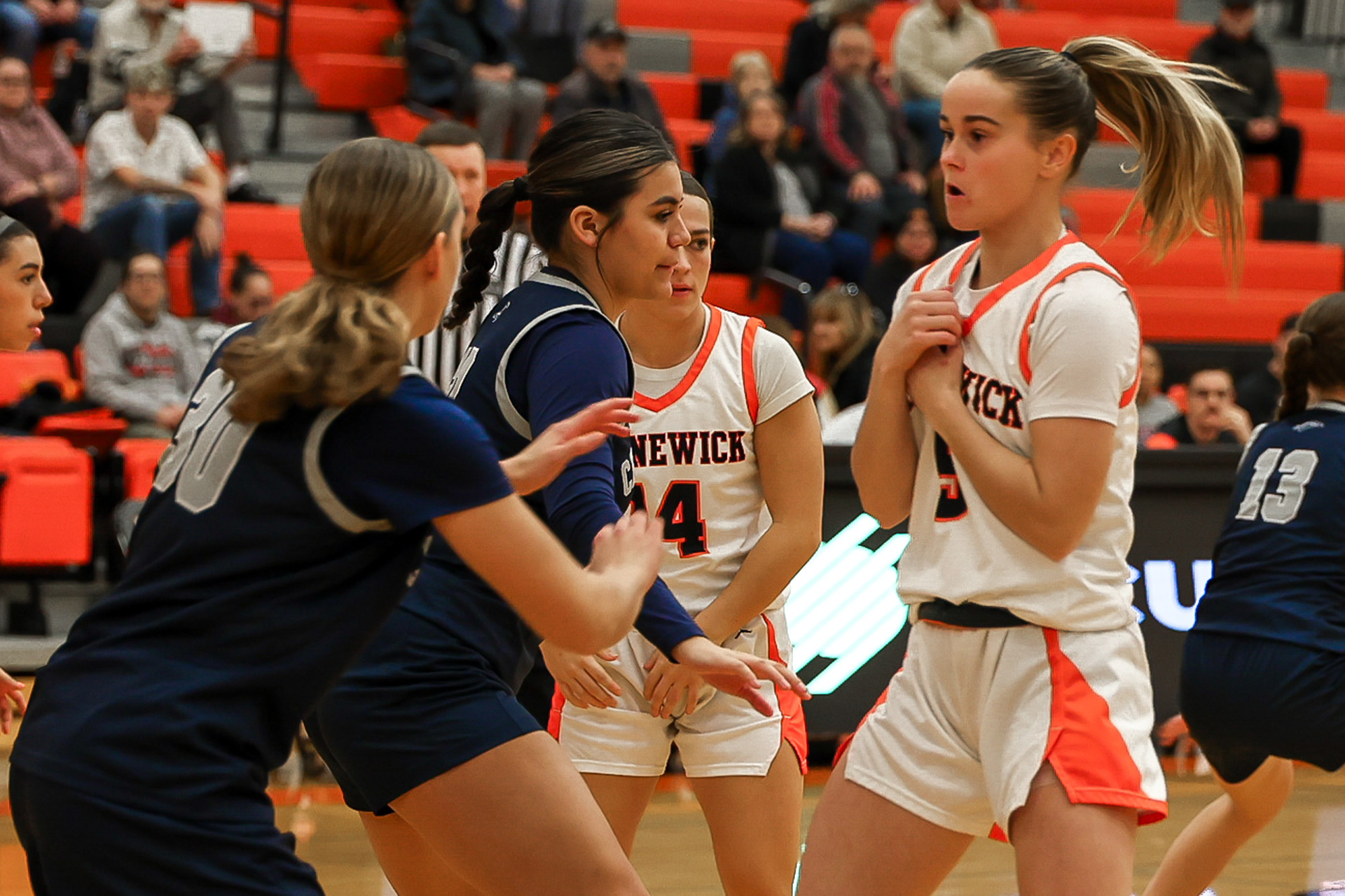 Richland High School Girls Volleyball players block a shot at the net during a home game against Walla Walla.