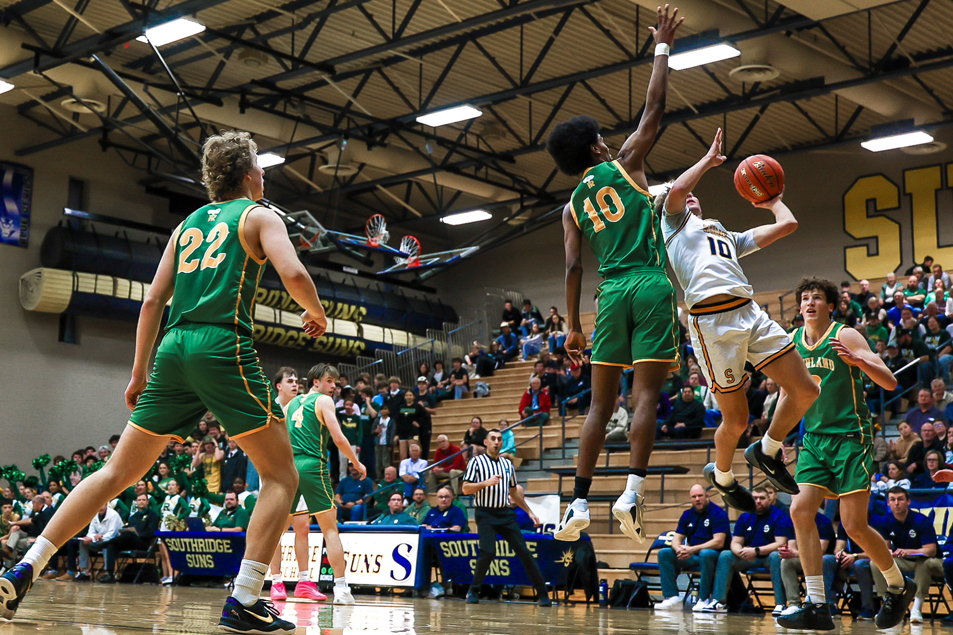 Southridge defenders tackle a Richland High School receiver during a high school football game in Richland, Washington.